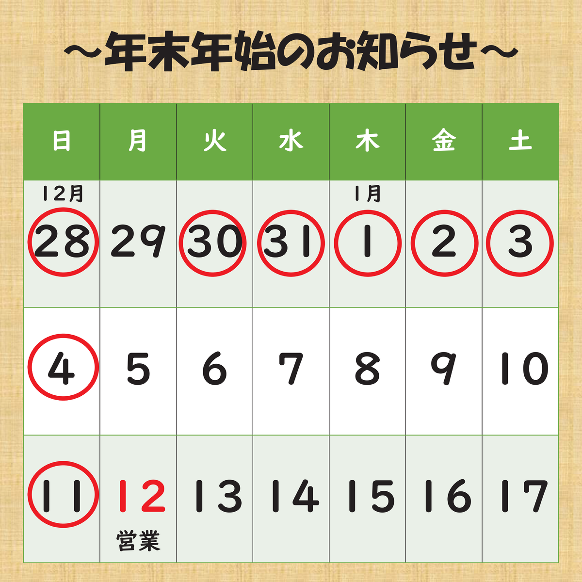 年末年始のお知らせ