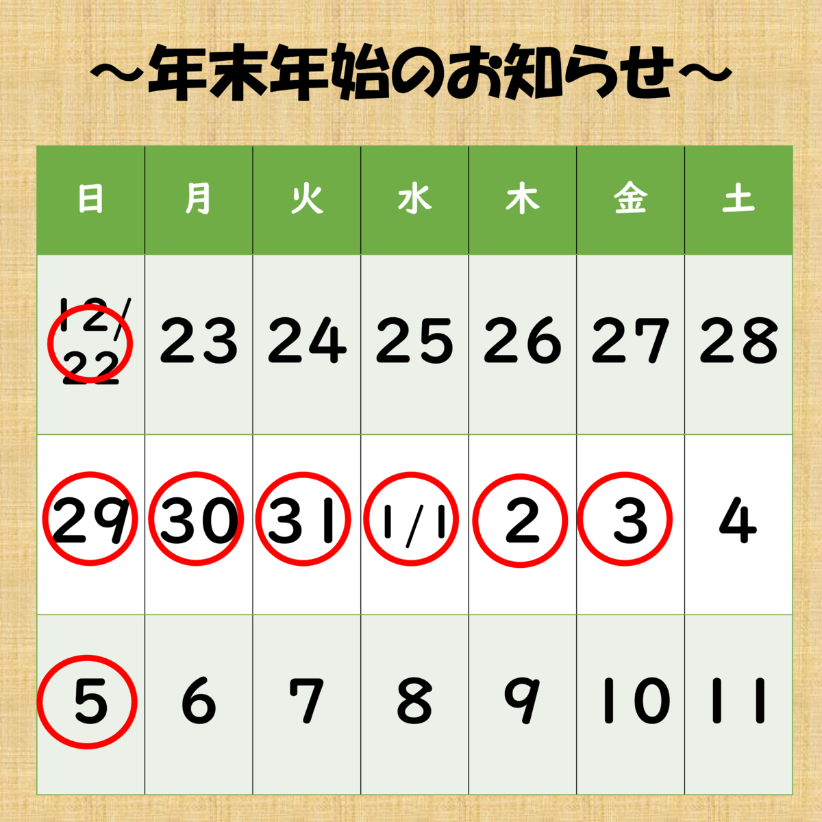 年末年始 営業日のお知らせ